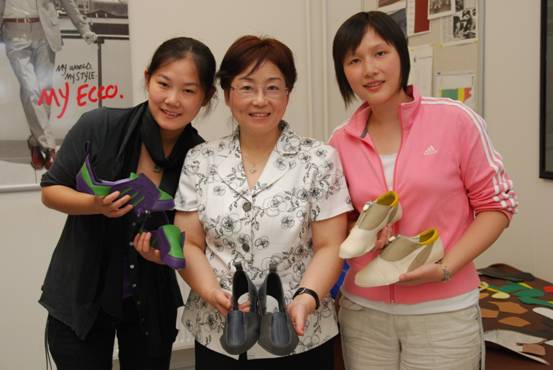 服装·艺术设计公司与世界上三大休闲鞋类品牌公司ECCO建立了友好的合作关系,并为公司培养鞋类设计师设立了ECCO奖学金,今年8月选拔两名优秀员工赴丹麦ECCO公司进行交流与实习。通过平时成绩考查、专业技能考试、口语面试等一系列的测试,员工田玉晶和黄政荣获了这次机会,公司并委派俞英 老师一同前往ECCO公司,师生在ECCO公司设计并制造了属于自己的ECCO鞋。
