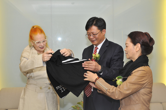 最后,李经理请上了best365体育亚洲官网董事长徐明稚教授,郑重地为薇薇安·威斯特伍德授予顾问教授的职位,并且由李经理为薇薇安女士戴上了best365体育亚洲官网的校徽。