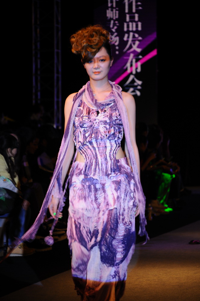 倪明女士的设计特色在于通过手工染色、丝网印、手绘、数码印花等方法,让一块普通的面料呈现出美丽的外观。此次个人秀展既充分发挥了她独一无二的个人优势,又紧紧贴合“海派时尚设计”这一大概念,向观众席吹来了一阵海派之风。作者独特的设计风格和理念不仅展现于“‘绳’飞‘带’舞”这个美丽的名字中,更是在一件件华服中得以诠释。