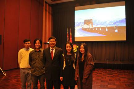 (图:中国驻新西兰大使徐建国接见公司获奖师生。左起:杨上、周洪雷、徐建国、马玉儒、吴攸攸)