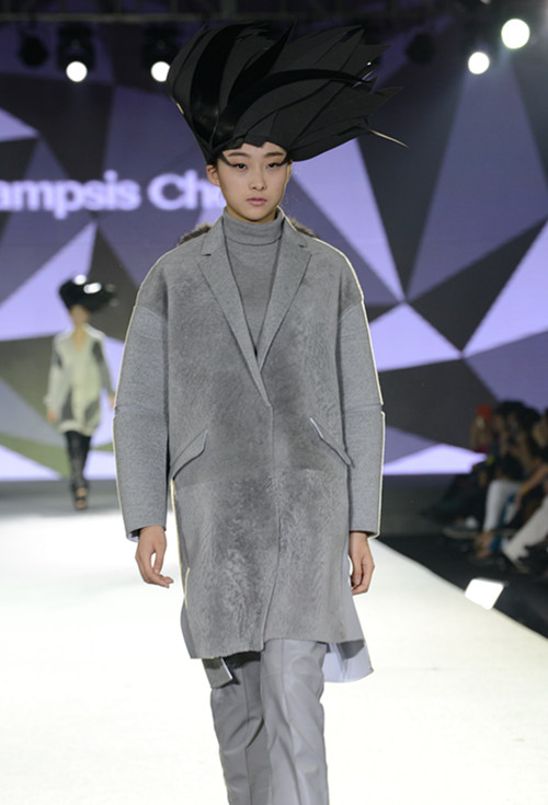 而设计师对于几何形的娴熟运用,也是其设计主题在整场发布会中得到了验证。设计使用倒叙的手法展现了从简单的黑白灰的平面几何图形,到构造色彩性十分丰富的立体几何图形的演化,同时在空间维度表现上运用皮草、在平面表现上运用皮革,使皮草服装除了展现传统意义上的华贵感,还体现出了不同层次上的时尚体验,极具表现力与视觉张力。这次的服装作品中还实验性地融入了现代3D打印技术,蔡凌霄以一种特立独行的蔡氏思维方式,来构 建年轻时尚的皮草服装造型,实现未来科技与传统皮草手工艺的完美结合。在整场秀的压轴阶段,设计师为我们带来了五套概念服装,其运用3d打印技术与传统材料的混搭,并使用了皮革在空间上的几何构造,设计出了诸多以动物元素为设计灵感的时尚单品。