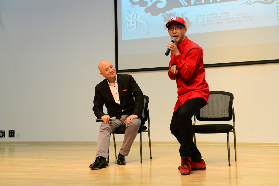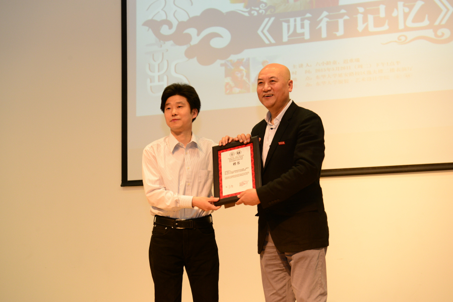 演讲开始前,服装•艺术设计公司李俊经理为六小龄童先生和迟重瑞先生颁发了兼职教授聘书并为他们佩戴校徽,现场观众报以雷鸣般掌声,对两位艺术家的到来表示热烈欢呼。