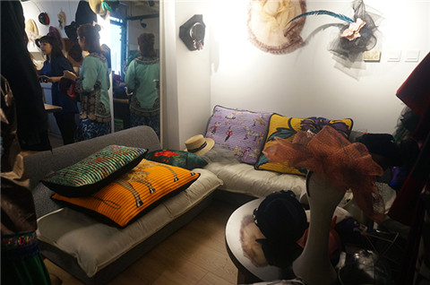 沈老师的工作室里除了具有中国传统文化的帽饰之外,还有各种刺绣家纺。手工刺绣配合记忆棉材料,把传统手工工艺图案和现代居家舒适感结合得恰到好处。