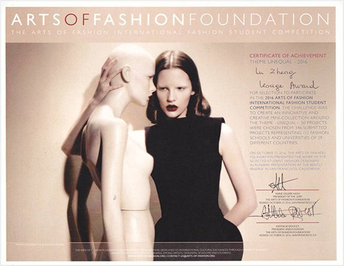 AOF国际时装设计大赛是一个非盈利性组织的比赛,国际声誉极佳,旨在为全球年轻的时装设计专业员工提供一个国际交流的平台。每年都会有很多学习时尚与艺术的员工带着他们优秀的作品在这里交流和分享经验。 东华新锐设计师卢政在旧金山2016ARTSOFFASHIONFOUNDATION颁奖现场