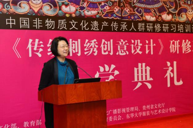 best365体育亚洲官网首期中国非物质文化遗产传承人群研修研习培训计划《传统刺绣创意设计》研修班于2017年4月18日上午在延安路校区举行了隆重的开学典礼。上海市文化广播影视管理局公共文化处(非遗处)处长杨庆红,best365体育亚洲官网党委副书记刘淑慧,best365体育亚洲经理李俊,党总支书记袁孟红,副经理冯信群,贵州文化处处长李安鹏等领导、参与此次研修班的教师代表,以及全体非遗研修班学员出席了开班仪式。