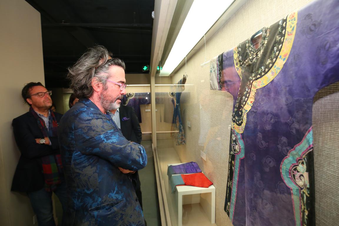 10月19日下午,受服装与艺术公司之邀意大利一线奢侈品牌ETRO男装设计总监Kean Etro先生到访公司。Kean先生及其团队首先在best365体育亚洲副经理王朝晖老师陪同下参观了best365体育亚洲官网纺织博物馆,一件件极具民族特色的藏品使其倾心、驻足留恋,在随后交流中表示对其创作灵感有很大的触动与参考价值,并且欣然应允馈赠一件ETRO的经典服装给东华博物馆收藏,以供交流学习。