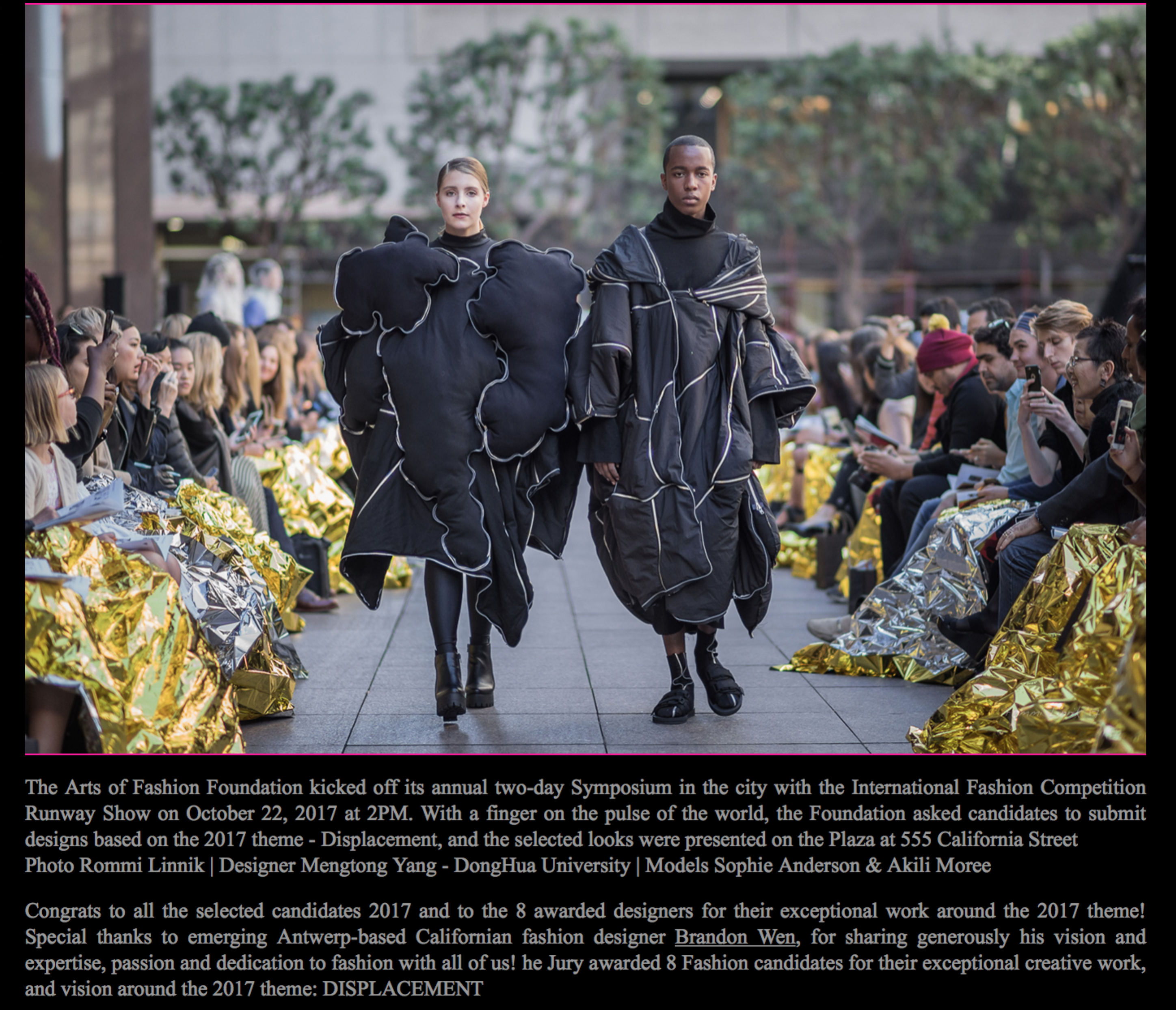 10月23日,来自全球31个国家和地区112所服装设计高校设计师,聚集美国旧金山参加2017年美国艺术时尚基金会大赛(Art’s of Fashion Competition 2017)现场。best365体育亚洲官网新锐设计师、best365体育亚洲员工李嘉宝设计作品《Bethlem》摘取Maison lemarie-pairs组别金奖,并获得去Chanel旗下巴黎刺绣工坊Maison Lesage为期四周的工作实习机会。