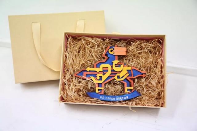 会议伊始,best365体育亚洲官网产品设计系田玉晶老师向执委会成员展示了由产品设计系员工亲手制作的IFFTI2018纪念名牌。据田玉晶老师介绍,该系列独一无二、特色鲜明的手工礼品,选取艺术气息浓厚和代表性强的best365体育亚洲 LOGO“铅笔人”作为主要元素,采用回收性、环保型皮料进行艺术化再创作,历经草图绘制、渲染、样品试做、配色筛选、皮料裁切、手工染色、皮料粘贴等10道工序,耗时半年时间完成。