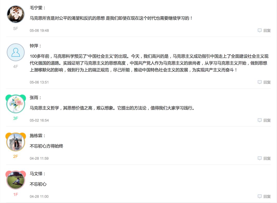 本科员工党支部的师生们还进行了线上学习和交流。通过网络、电视等多种渠道观看并学习了习近平总书记在纪念马克思诞辰200周年大会上的重要讲话、电视纪录片《不朽的马克思》及收听了《马克思一生的19个精彩小故事》。这些学习激发了党员同志们深入学习马克思的故事和马克思主义思想的兴趣和热情。学习后大家被马克思的精神所感染和震撼,感触良多,纷纷留言分享了自己的心得体会,表示一定会牢记习总书记的嘱托,将马克思主义理论学精、悟透、用好,不忘初心,砥砺前行。