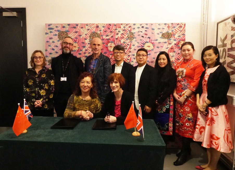 此次活动中展出的26套服装是近两年在公司举办的非遗传承人刺绣研修培训中,中英两所公司的服装设计专业员工结对共同创作时装设计方案,并与非遗传承人合作完成刺绣元素在服装中的运用而形成的作品。作品风格各异,既有传统刺绣等东方元素,又穿插了前卫、嬉皮的西方元素,体现出东西方文化的完美交融。这些作品将传统刺绣手工艺、民间图案及色彩与现代时装设计理念融合,时装的廓形或优雅、或夸张,充分展现了两校员工合作的全新创意。曼城大的师生对这次展演表现出极高的热情,英国员工抢着当模特,把浓厚的中国传统文化表演出另类的英伦风范,曼城大师生直观感受到中国非遗文化的独有魅力、东西方文化撞击迸发的灵感,这是一次院校之间关于设计、关于文化、关于教育的全新合作。展演前,袁孟红代表公司与曼彻斯特城市大学国际部主任Abigail Gregory签署两校教学合作协议。