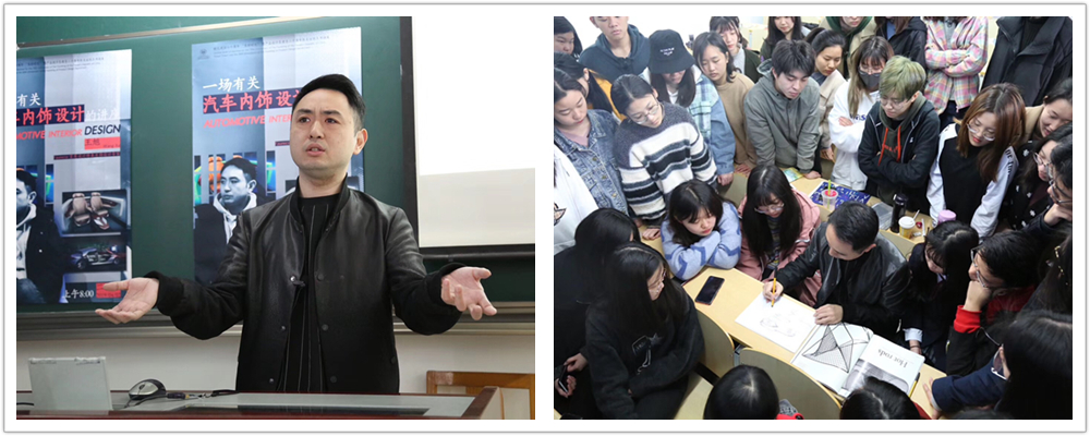 Faurecia首席设计师、产品设计系员工王旭在《一场有关汽车内饰设计》的讲座中,以毕业以后的职业发展生涯为引线,为大家详细介绍了汽车行业、汽车内饰设计的专业知识、就业前景,同时还现场展示了汽车手绘技法,瞬间让讲座氛围达到高潮,最终他在现场演示了汽车设计构思的手绘表达过程。