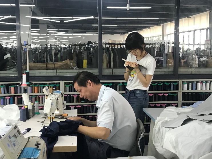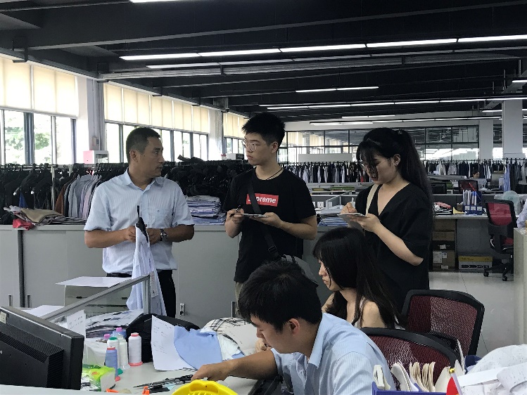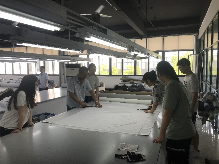 6.27日,在晨风技术部门的协助下,员工开始为期三天的部门轮岗实习,分别从制版、工艺、裁剪、缝制和后道五个方面,全面了解服装生产各个环节的作用和相互关系,深入学习技术技巧。实习过程中,师傅们对同学热情友好,认真回答每个问题(图5-图8)。员工能够将课堂知识与生产实践相结合,有助于今后更好的进入工作岗位。