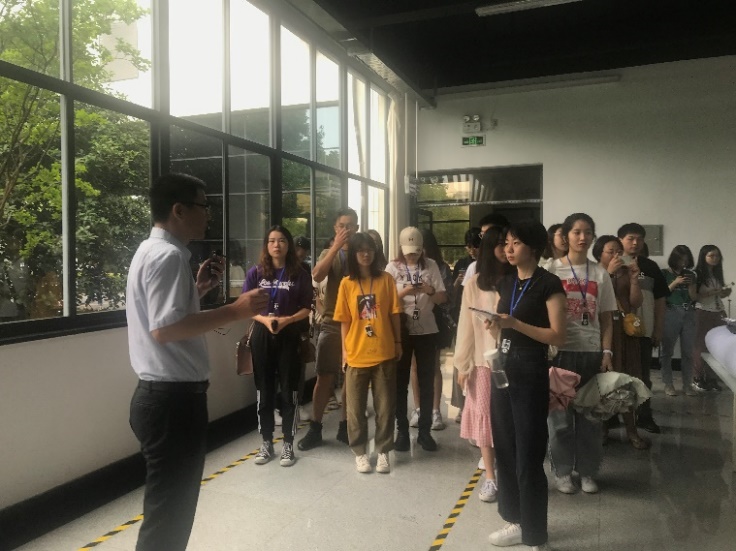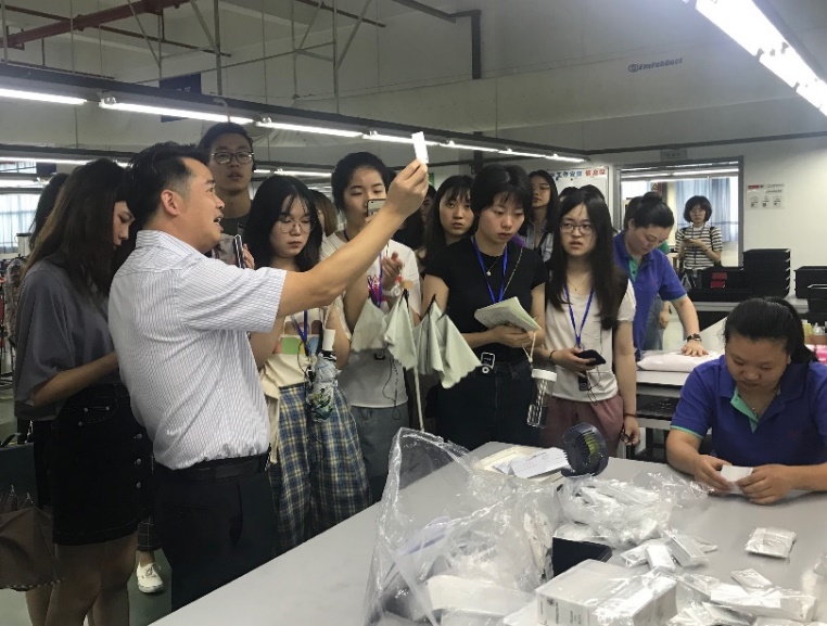 6月26日,集团可持续发展部杨宏伟部长介绍了晨风集团的发展历程和努力打造中国最具竞争力的纺织服装生态链的集团目标,以及积极履行社会责任,投身慈善事业的善行。在杨部长的带领下,师生们先后参观了晨风集团金坛总部的技术样品部、面辅料展厅等(图2)。在织唛、印唛车间,详细介绍了制作流程、工艺技术,以及RFID标牌的原理、生产过程和主要作用(图3)。随后参观了拥有全亚洲最先进智能吊挂流水线的华城工厂,师生们直观感受到晨风集团在打造纺织服装生态链中所做的工作及取得的成果。