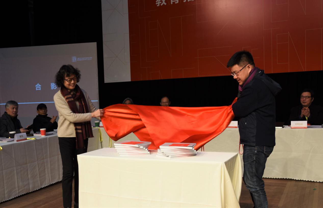 全国艺指委秘书长丁凡教授与上海戏剧公司经理黄昌勇教授为新书揭幕(《上海艺术专业学位研究生(美术、艺术设计领域)优秀作品集》)