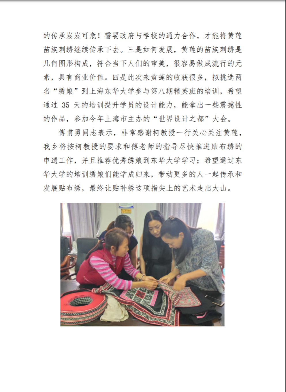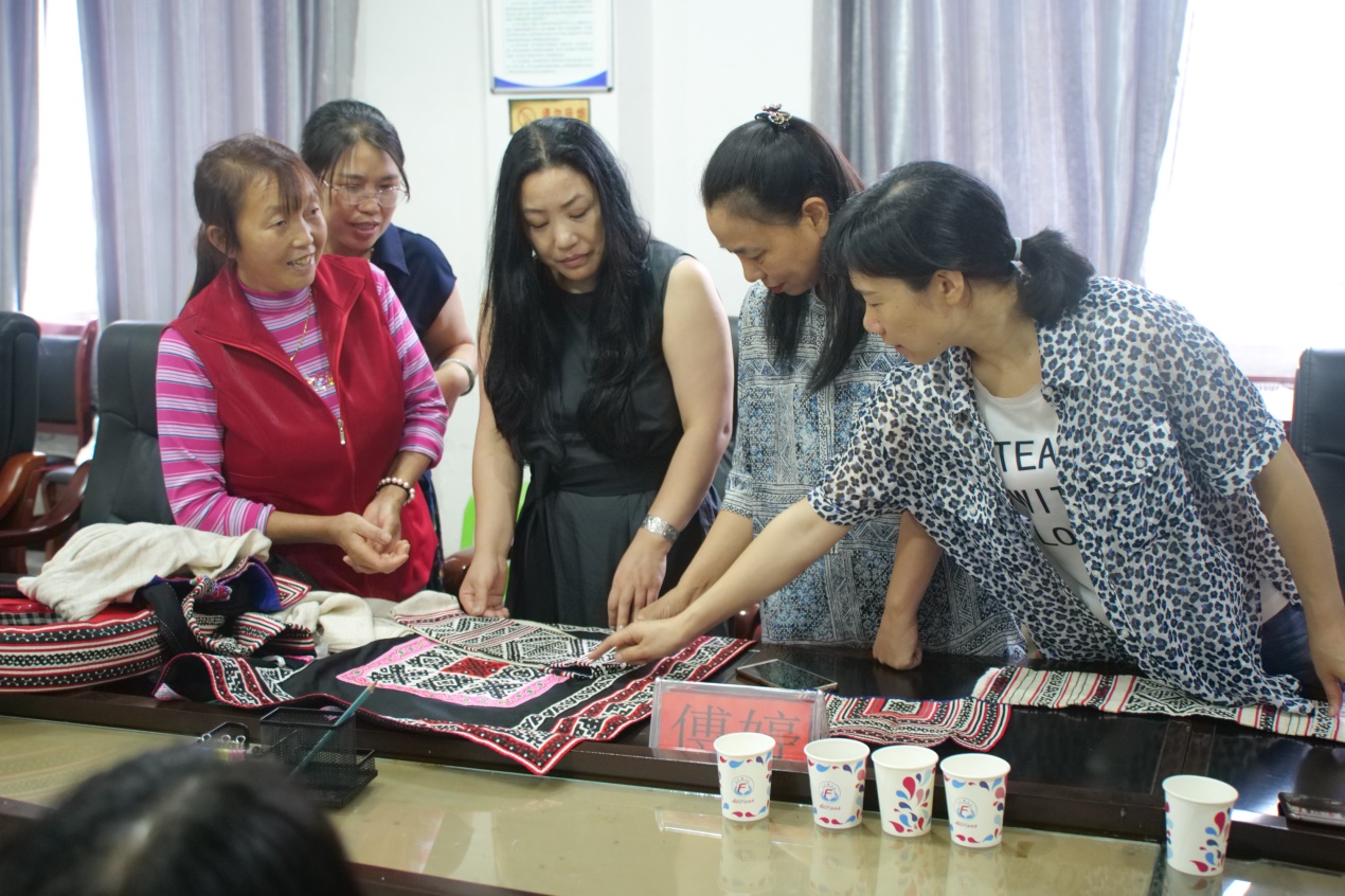 当晚回访小组夜宿马鬃红苗客栈,县妇联主席梁秀容敲开了带队教授柯玲主任的房门,登门诚邀回访组次日去桐梓县的最后一个贫困乡——黄莲乡调研和指导。连日的奔波,加之山路的崎岖、急弯和陡坡,使一位老师身体严重不适,且东华老师在来遵义之前与贵州省非遗处领导交流时,已经欣赏过黄莲乡的贴布绣之美,东华学员陈梅的分享也已引起了省厅高度重视并当场落实了培训任务和经费。但当梁主席说当地领导和绣娘们翘首以待东华老师们的到来且都已备好绣片等待时,柯主任没有过多犹豫,半夜决定调整次日行程前往黄莲乡。