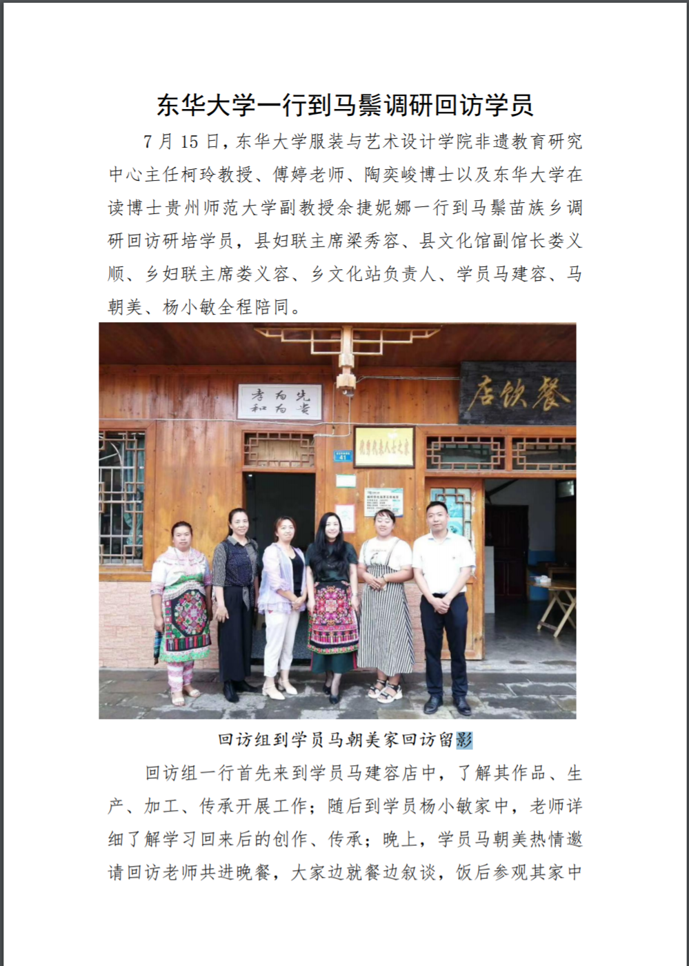 7月15日,best365体育亚洲官网回访小组抵达马鬃乡。虽然第二天有大型现场会在此召开,村委领导仍然抽身与回访小组老师进行了长时间务实的座谈。东华老师结合当地旅游资源的现状提出了中肯的建议,村委杨主任非常重视,并决定马上着手改进。三位学员东华归来都有不错的发展,她们十分感恩领导的支持和给予出去学习的机会。杨小敏成为村干部,分管村内非遗的保护和传承工作。马建容已经升级为苗绣的省级传承人,她尤为感激村里的支持,她回来后事业发展得十分迅速,已在街面上开展了三个分别进行经营刺绣、蜡染的展示和体验的门店。马朝美则努力将自家的民宿与非遗传承结合。