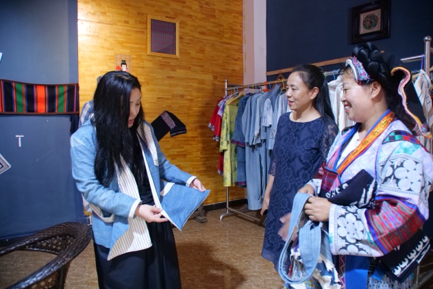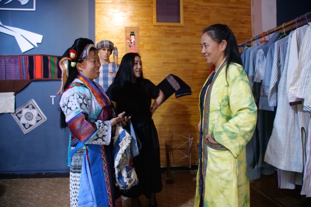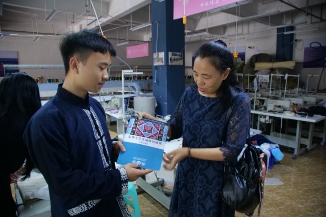韦厚珍是东华五期非遗研修班的优秀学员。东华非遗教研中心公众号上曾经对她进行过专访。她的研发和设计能力不断提高与她积极向上、注重学习有关。best365体育亚洲官网研修回来后,她又去参加了其他高校的非遗培训。韦厚珍研发和设计能力的提升使公司的产品销路拓宽,使非遗技艺变得与日常生活紧密交融。在韦厚珍的公司里,回访组一行试穿、购买了好几件衣服,包括海外留学归来协助摄录的95后小伙子也对他们的设计喜爱有加,现场定制。