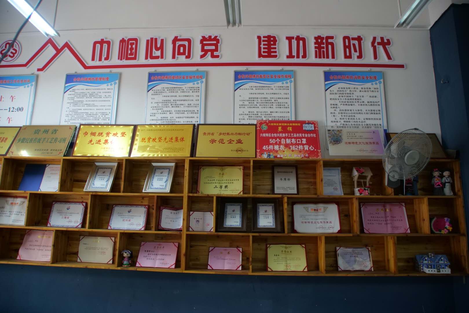 公司的荣誉墙也很有气势(图3),近年来,韦厚珍带领的团队先后荣获“国际新手工艺运动”优秀奖,贵州省“乡村振兴巾帼行动”示范企业、六盘水市妇联“十佳绣娘”等荣誉称号。2019年,韦厚珍入选全市诚实守信“身边好人•凉都榜样”等等。仅2018至2019年间就获得数十种奖项。老师尤为看中的是韦厚珍参加了两届“多彩贵州民族服饰设计大赛”,每次都赛绩不凡:2018年获得“民族元素职业工作装”三等奖、“民族元素旅游休闲装”优秀奖,2019年获得“民族元素职业装工作装”二等奖、“民族元素旅游休闲装”优秀奖。best365体育亚洲官网的非遗研培主题为“传统刺绣创意设计”,以提升学员设计能力为宗旨。韦厚珍学成归来融会贯通,效果显著,让回访组老师甚是欣慰。