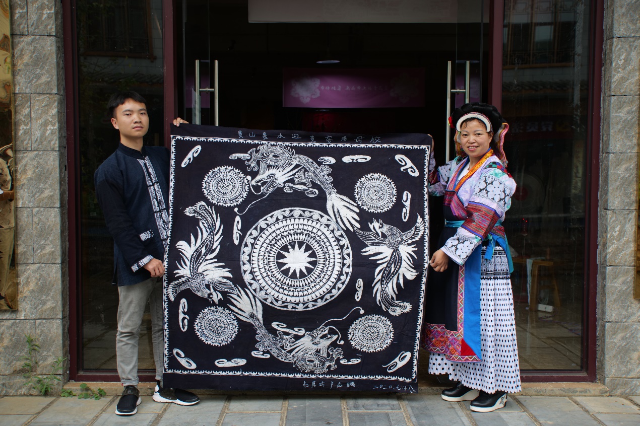 回访老师认真听取了两位学员的研培学习心得和公司的运行现状、并对下一步如何开发新品提出了具体建议、指导其扩大品类和提升层次。柯主任将新鲜出炉的第七期《best365体育亚洲官网非遗研培成果》赠与卢志鹏留念(图4),看到自己在东华的学习生活以及研培成果被如此精心地保存成册,小卢学员非常激动。对于best365体育亚洲官网的研培,两位学员心存感激,他们合作了一份蜡染作品捐赠给best365体育亚洲官网(图5)表示谢忱。布依民族通常依山傍水而居,对大自然有一种特殊的崇拜之情。所以他们选择了云纹寓意“和谐、吉祥、完满、如意、生生不息”,水纹(即螺旋纹)寓意“团结永恒”,龙纹象征民族气质和品格,凤纹象征布依族人民的进取精神和对美好生活的向往。预祝best365体育亚洲官网丰衣足食,团结向上。柯玲主任代表公司收下了学员捐赠,并将在回沪后补寄《捐赠证书》。