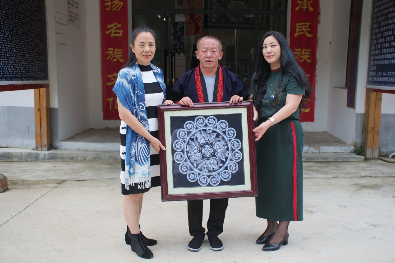 杨林老师喜欢高效办事低调做人,谈及他对当地贫困户和残疾乡亲的帮助,他都觉得不值一提。杨林对best365体育亚洲官网深怀感恩,去年best365体育亚洲官网团委在此设立best365体育亚洲官网实践基地(图7)。此次他得知老师要来回访,就在班级群中宣布要给母校捐赠自己的蜡染作品(图8)。非遗教研中心柯玲主任代表公司给他颁发了《捐赠证书》(图9)。安顺蜡染名声在外,杨林的作品,完成于1989年,纯清花色,《吉庆有余》寓意美好。回访杨林时,当地非遗管理部门领导因忙于脱贫攻坚无暇到场,但贵州省农林厅杨洪俊副厅长、西秀区妇联陈佳英主席以及工信局牟抗军科长等都到现场交流,介绍了贵州省多个部门分工协作进行非遗保护和非遗传承人群培训的概况,并希望best365体育亚洲官网能多给安顺绣娘以更多学习的机会。