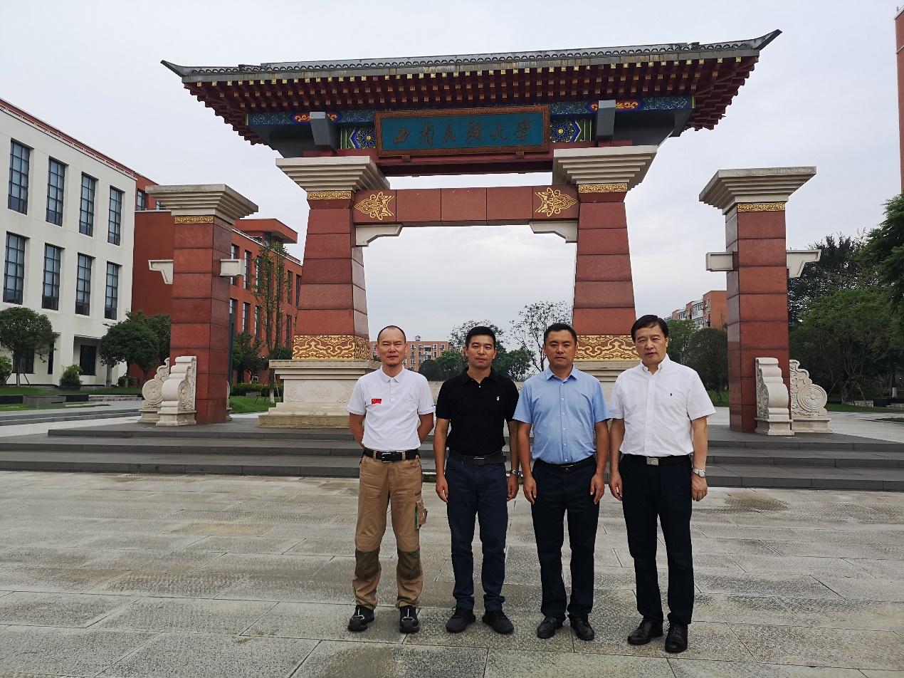 西南民族大学党委副书记、副董事长三郎扎西(右二)、建筑公司经理赵兵(右一)与余继宏老师交流留念
