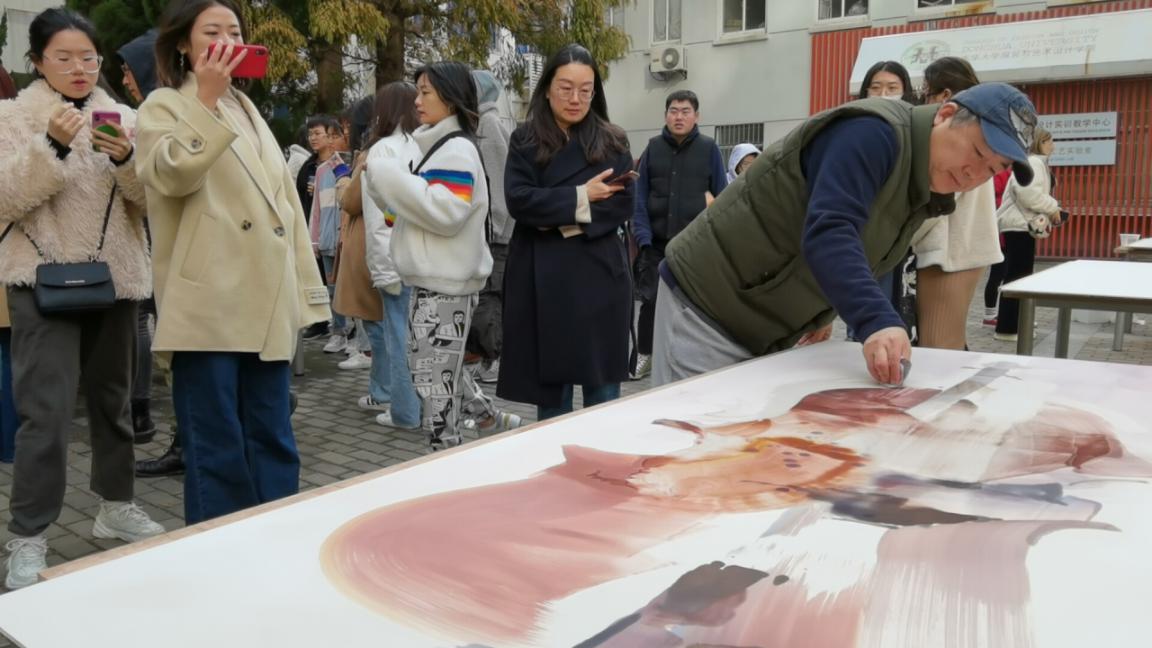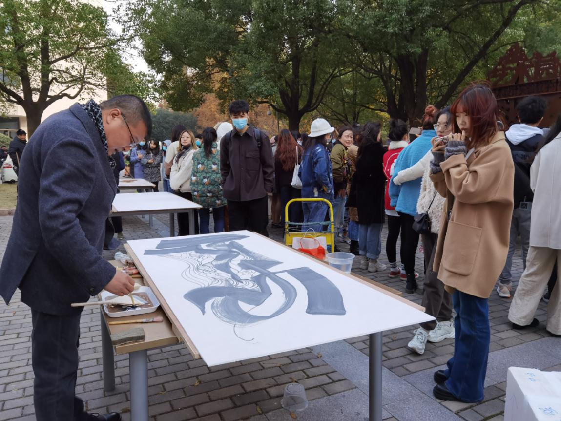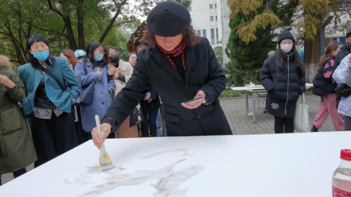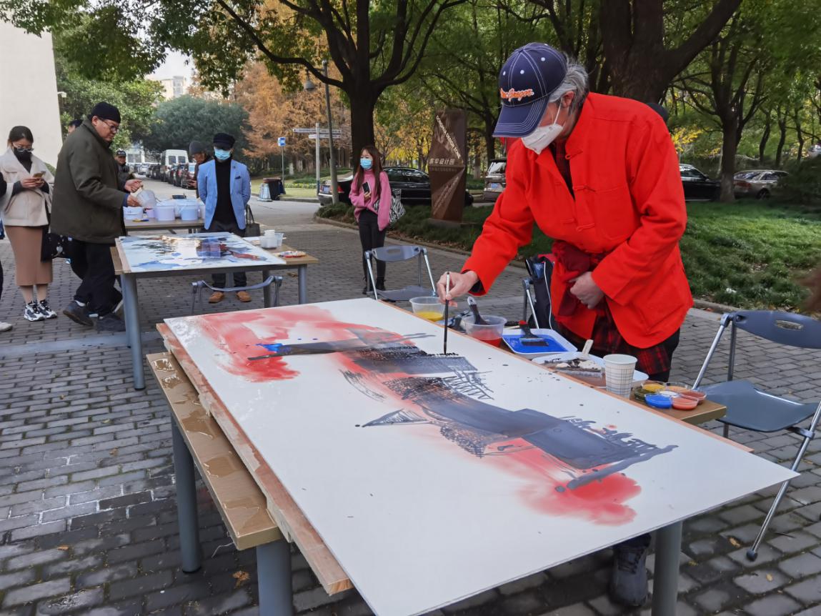 据《艺术与工艺》公开课组织教师赵强副教授介绍,通过邀请艺术家与员工共同参与课程创作,不仅为课程增添了创作方式多样性与元素表达丰富性,更有助于员工通过观摩大师运用不同材料、工艺技术进行创作,提升自我创作技能和艺术修养,也为后续的艺术创作做好基础性铺垫和提升创作自信心。在活动现场,艺术大师们与东华员工们创作激情高涨,共同执笔创作个性作品与艺术才情,完全不惧初冬丝丝寒意。师生们在现场创作的作品形式多样,包含巨幅陶瓷水彩作品和陶瓷圆盘青花作品,内容涉及抽象艺术、建筑表现、花卉与动物表现等多种元素。