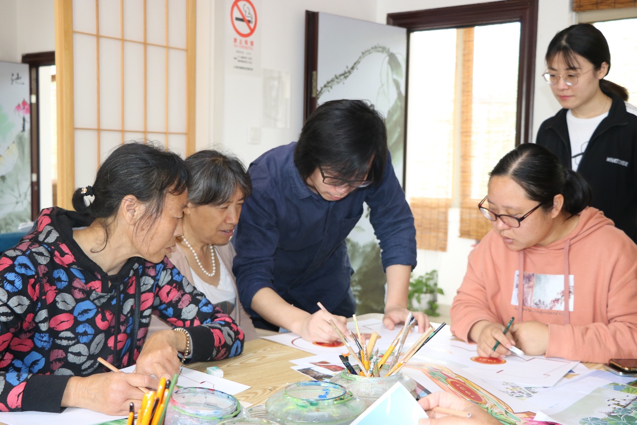艺术设计第二党支部纪检委员吴春茂副教授结合积极应对老龄化、提升老年人主观幸福感和校地党建共建,为五四村村民介绍了本次活动的背景和意义。艺术设计二研究生党支部支部书记连梦菲为五四村老人讲解了本次共绘的创作步骤和技巧,启发老人们结合藏红花、水稻等五四村特有的风土人情,描绘建党百年之际自己心中的五四村。