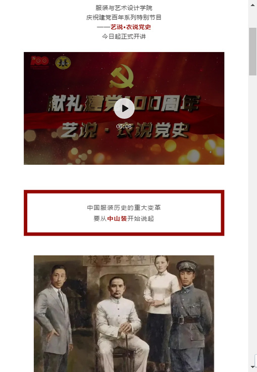 党史学习教育重在实效,面向广大青年师生的党史学习教育,尤其讲究温度与智慧。公司党委坚持小切口、高站位,聚焦专业的小知识点,将党史学习教育内容与公司专业特色有机结合,策划开设“艺说·衣说党史”专栏,师生联袂齐上党史大课,围绕中山装、文明新装、人民装、军装与工作装、国际化时装、功能服饰设计、时尚与创意服饰8类服饰,开设6堂党史微课,展现中国近代新历程。