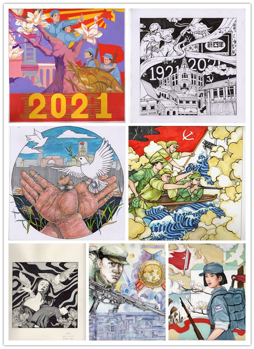 在公司党委的引领下,公司教师坚持立德树人,充分发挥课堂育人的主渠道作用,积极探索党史学习教育融入公司产品全过程的新途径。视传系主任彭波教授指导员工以“建党百年”为主题开展毕业设计,相关视觉形象海报和衍生产品在毕业季展览时让人眼前一亮。美术学部主任李海峰副教授、李军平副教授在《图案设计》的艺术类基础课上,带领大一员工围绕新四军题材进行图案设计,将课程上成了富有深意的艺术特色党史学习课。在老师的指导下,同学们积极收集、学习新四军相关历史资料,在深入了解的基础上进行了艺术创作。师生们很自然地把党史学习教育的使命和专业课、基础课的教学目标有机结合起来,使党史学习教育更加鲜活,更加生动。