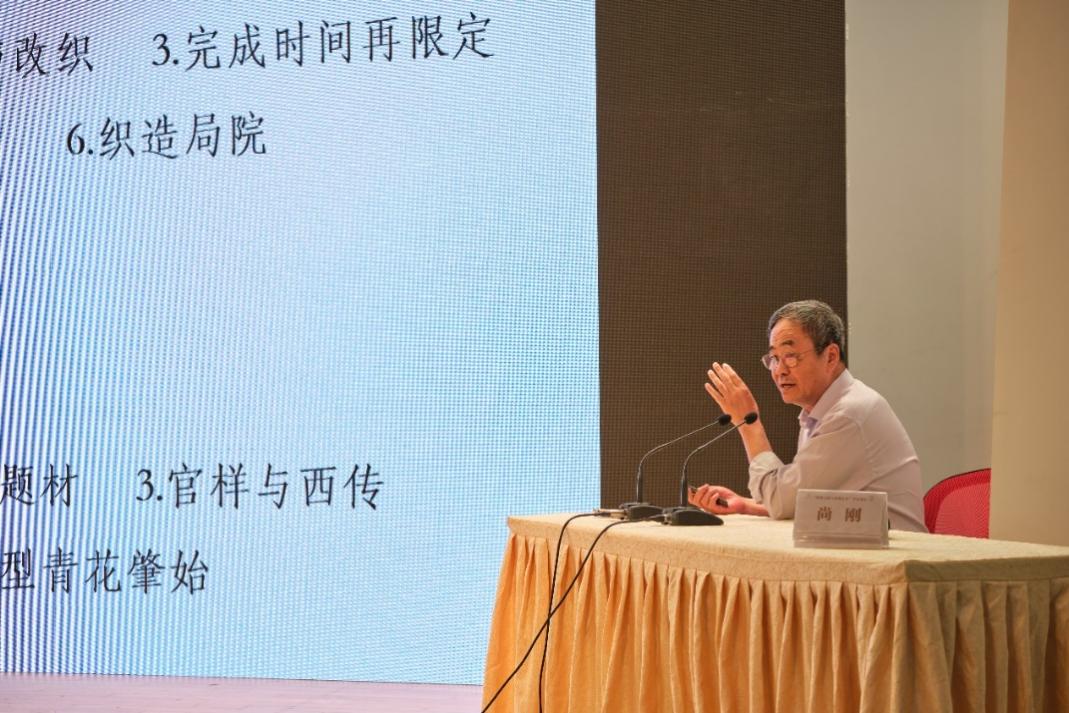 清华大学美术公司教授尚刚的报告《风云与造作》由1328年元文宗弑兄、1340年元顺帝复仇的史事出发,讨论了三种元代官府作品的时代。认为刻丝大威德金刚曼荼罗属于织佛像,完成应贴近元明宗即位的1329年2月27日;“太禧”款卵白釉印花瓷盘烧造于1328—1340年之间;满池娇图案的风靡应在1328—1332年,1340年以后退出了元代的官府图样。这一也是官府造作较民间造作更易受时局、时政影响的案例之一。