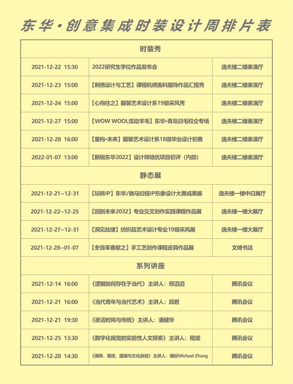 由于目前还处于防疫的管控时期,本次时装周活动只针对校内师生开展线下活动,针对校外我们将组织及时发布及本公众号的视频号展开部分内容的直播,期待大家的热情关注。让我们来期待一下本年度的排片表吧!
