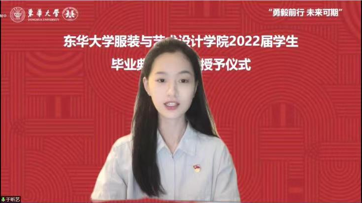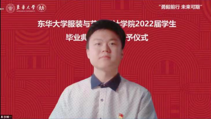 来自服装设计与工程2018级卓越班毕业生李博一,他回忆了四年的老员工活里的美好记忆,不管未来选择什么道路,都会牢记母校教诲,做拥有智慧并富有激情的、胸有大志并脚踏实地、德才兼备并勇于创新、负有责任并敢挑重担的人。表演1901班于昕艺作为在校生代表表达了对师兄师姐的感谢和不舍,为毕业生们送上祝福,祝愿毕业生们早日成为一名令母校骄傲的东华人。