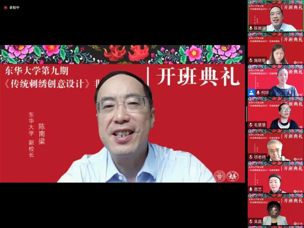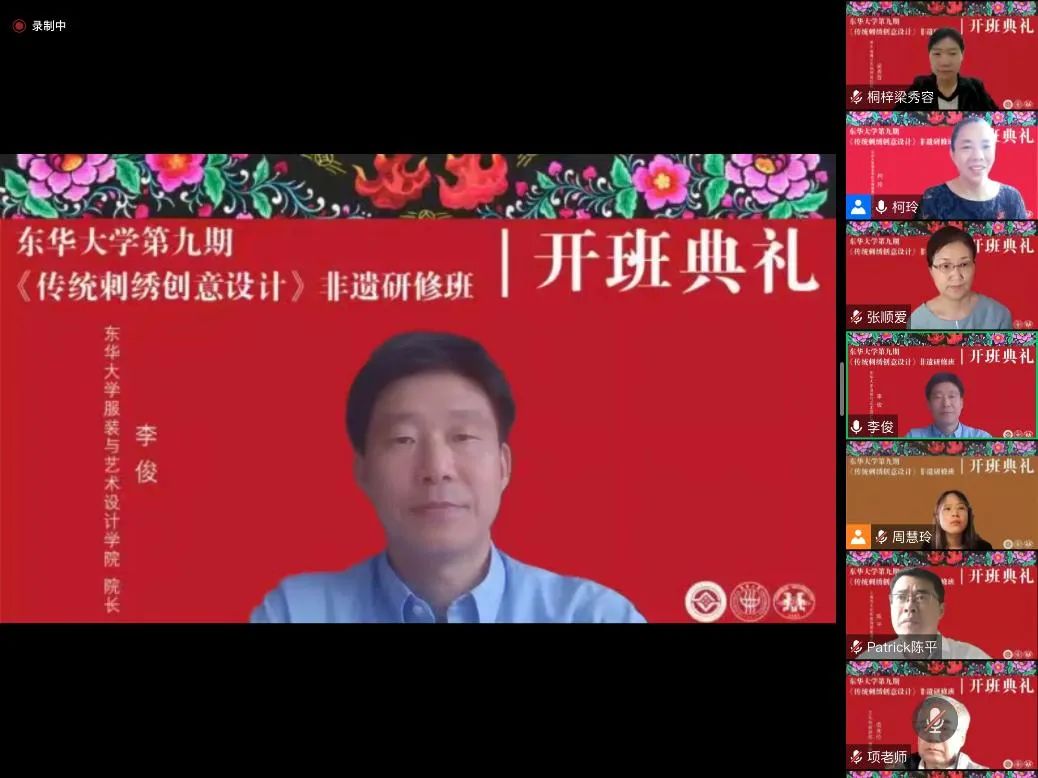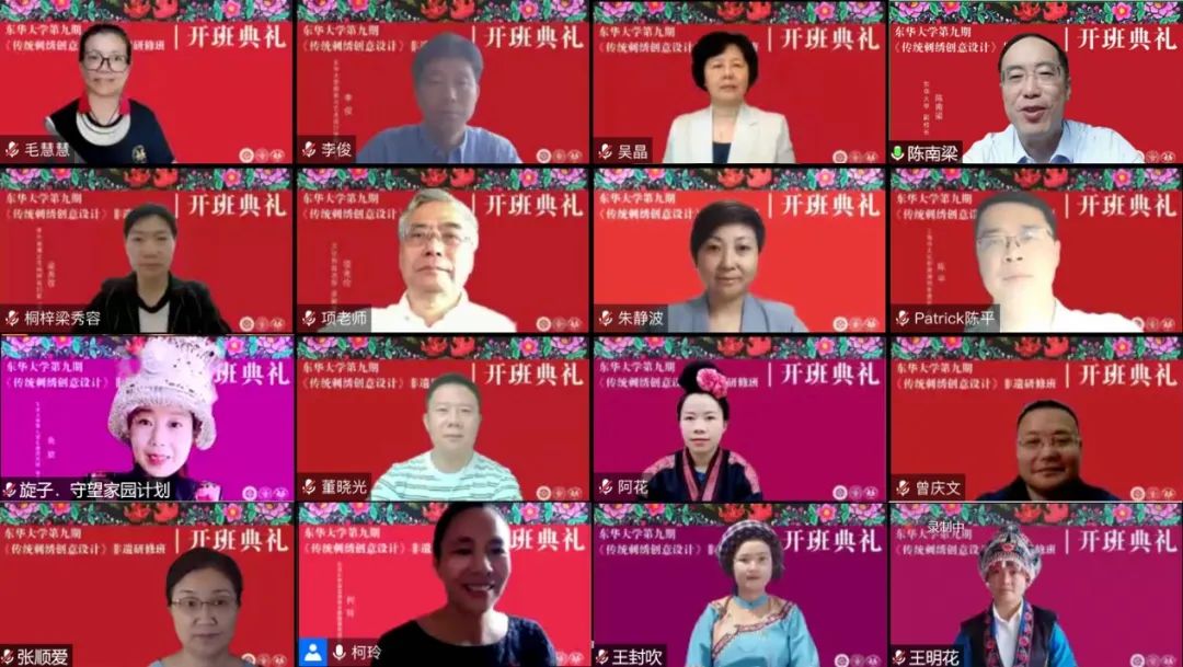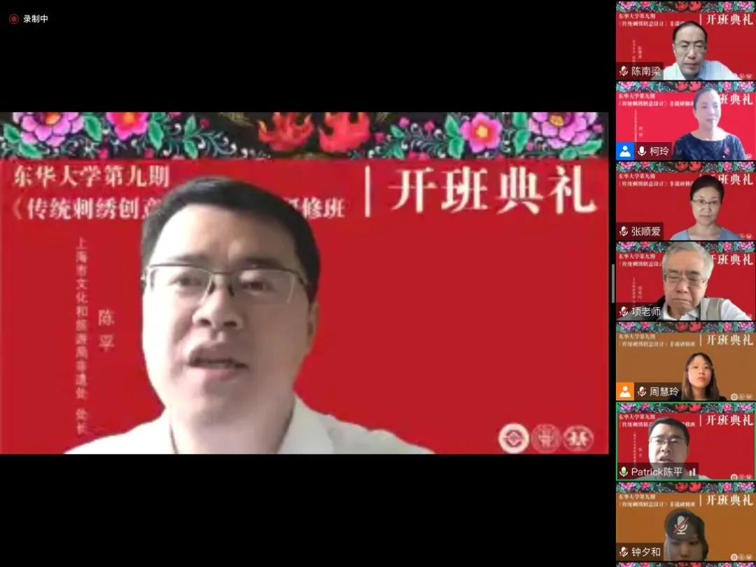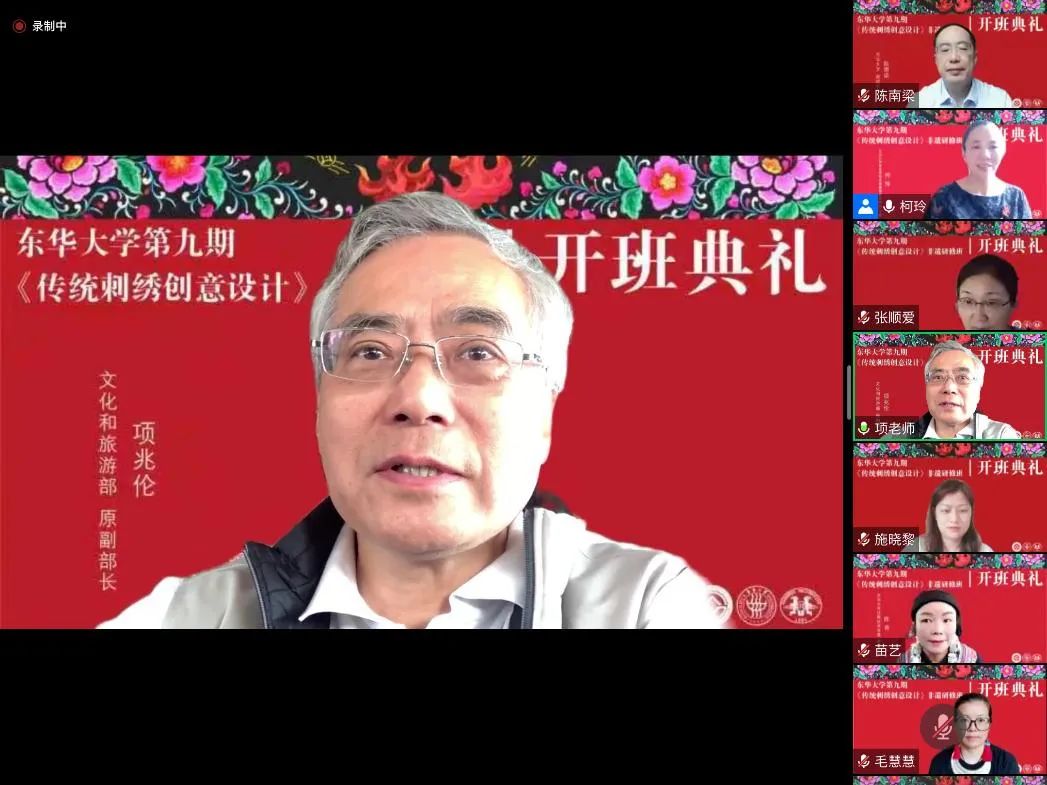 2022年9月12日上午,一场绚丽而又隆重的开班典礼在线上举行。best365体育亚洲官网第九期“传统刺绣创意设计”研修班在浓厚的节日气氛中如期开学。文化和旅游部原副部长项兆伦、上海市文旅局非遗处陈平处长、贵州省遵义市桐梓县妇联主席梁秀容等校外嘉宾出席了典礼。best365体育亚洲官网副董事长陈南梁、服装与艺术设计公司党委书记吴晶、经理李俊等校内领导以及此次研修班的任课教师、全体学员及结对设计员工等60多人参加仪式。非遗教研中心主任柯玲教授主持典礼。