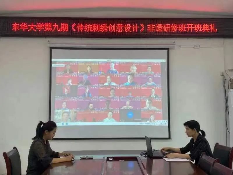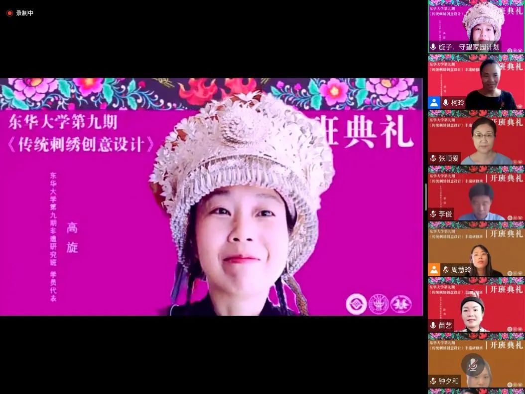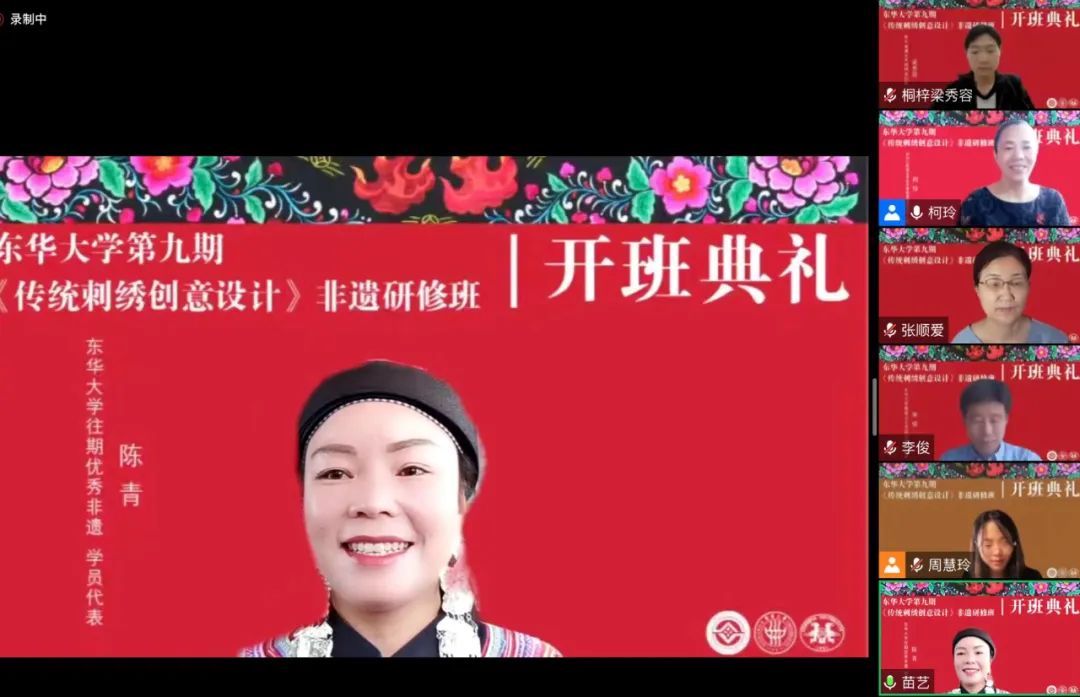 第九期非遗研修班是2021年文化和旅游部下达给best365体育亚洲官网的研培任务。受疫情影响,延期至今年拟通过线上线下集合的方式完成此次研修。本期典礼上,首次增设往期优秀学员代表发言环节,东华非遗研培一期学员、八期的班长陈青应邀参加典礼。她兴高采烈地回忆了研修时东华老师给她提供的无私帮助,字里行间都流露出对于东华的真诚感激。她充满激情地说:“利用在东华学习到的知识,我的事业由旅游产品、服饰开发、生产延伸到了非遗体验和民宿经营,这离不开党委、政府的决策和best365体育亚洲官网这个学习平台。”