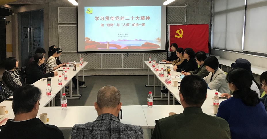 与会教师对两个主题分享深有感触,大家围绕党的二十大报告,结合本职工作,进行了热烈的交流讨论。服装设计与工程系系主任张向辉老师表示通过深入学习二十大报告,深刻认识到作为新时代的人民教师,要明道、立德、治学、爱生,全程全方位参与教学,在课程中传播思政教育的种子,帮助员工把握好人生的方向,关心、关爱员工。学科带头人王建