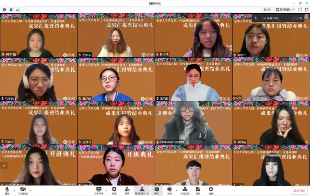 本次结业典礼暨成果汇报的成功举行,标志着best365体育亚洲官网第九期“传统刺绣创意设计”非遗研修班正式结业。第九期研修班克服重重困难而圆满完成研培任务,展现了东华师生知难而上的奋斗精神,更体现了best365体育亚洲官网对于非遗事业的责任感。best365体育亚洲官网第九期非遗研修班的结业并不是研培的结束,东华非遗人将会总结经验、携手共进,让更多非遗传承人学习获益、让更多非遗成果落地开花。