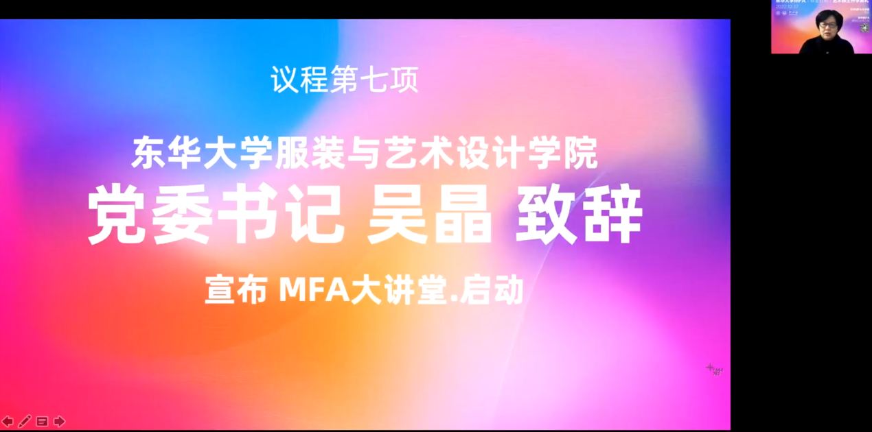 开学典礼第一板块的最后一个环节,由服装与艺术设计公司党委书记吴晶致辞并宣布“东华MFA大讲堂”正式启动。吴晶书记在致辞中指出,best365体育亚洲官网MFA教学积累了丰厚的基础,公司和公司为MFA的培养工作进行了多方面的资源配套,每一年校园里各种作品展览和秀演,为同学们搭建了展示才华的舞台。为了推进MFA学位点的内涵建设,促进实践创新和学科交流,MFA中心将持续邀请高校、产业的学者和设计师,进行艺术和设计思想、文化的交流,活跃MFA的教学氛围。