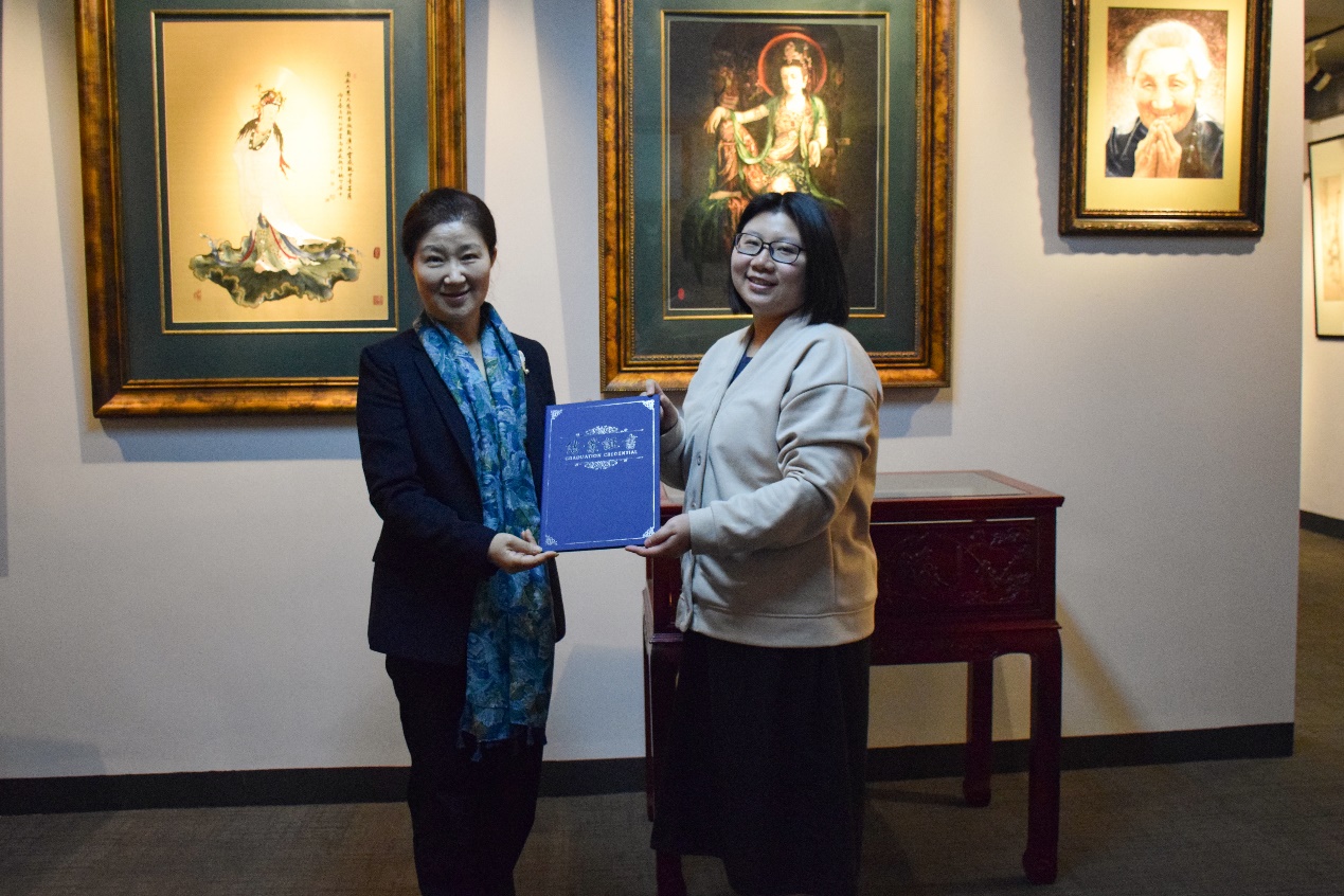3月10日,回访小组前往位于嘉定区的上海露香园顾绣研究院回访学员费菲,上海非遗保护中心办公室的钱张帆主任也一同参加。