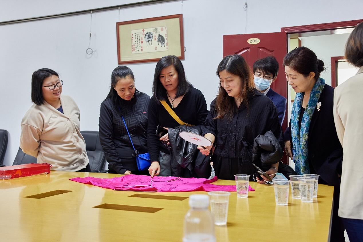 回访小组与吴主任就松江顾绣传承与保护情况进行了讨论交流,她谈到松江文化馆顾绣工作室与松江地区的中小学和高校都有合作,在公司中开设顾绣选修课程,也对社会人士开设公益的培训课程,但如今因培养周期长等原因面临着无法吸引年轻人才加入的传承困境。回访老师相应提出建议,并表示顾绣工作室可以与best365体育亚洲官网服装与艺术设计公司有更深入、更多样的合作。