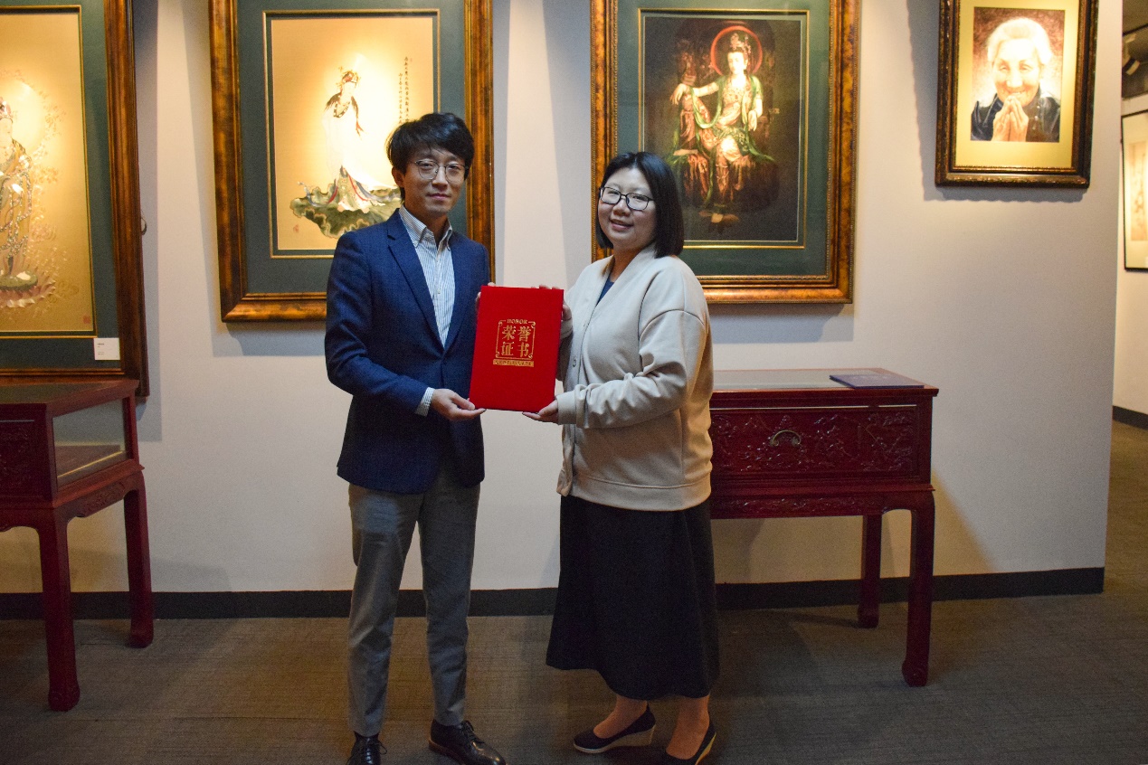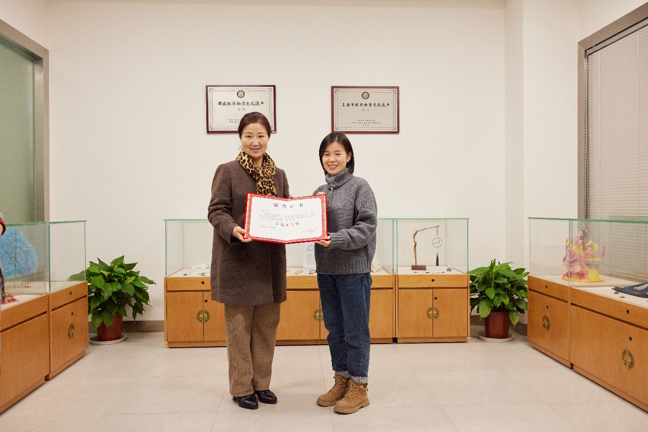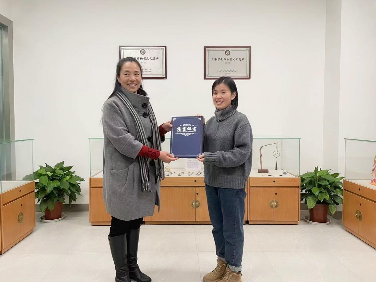 最后,非遗教研中心主任柯玲教授为陈华琼颁发《结业证书》,并给松江文化馆赠送了《best365体育亚洲官网非遗研培成果(第九期)》。中心教学指导张顺爱副教授颁发了《荣誉证书》。