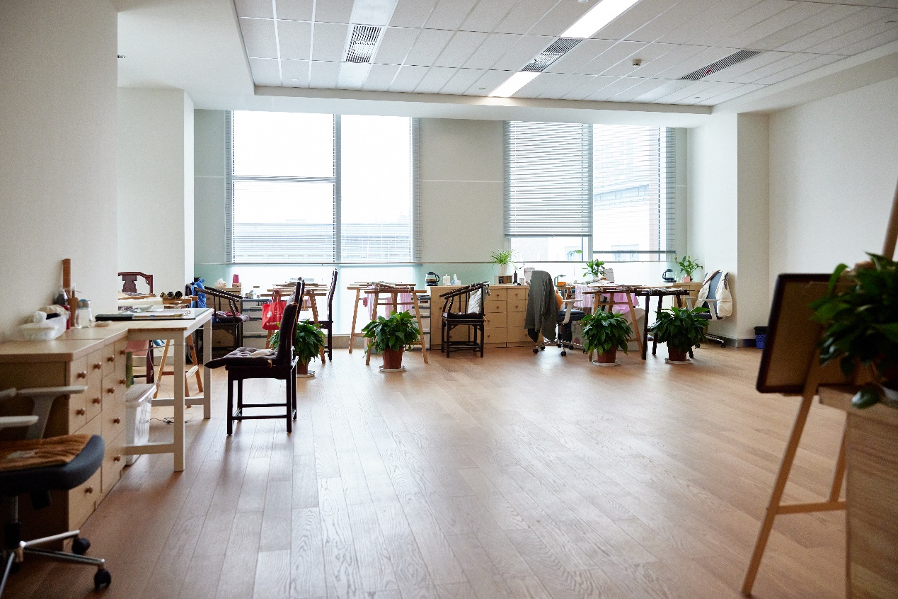 陈华琼和松江文化馆非遗中心的吴杨萍主任,以及东华往期研培的学员张莉带回访小组参观了工作室的环境。松江顾绣工作室于去年12月搬入位于“醉白池”景点旁的云间会堂文化艺术中心,绣娘们在自然风景优美、文化氛围浓厚的环境中刺绣,窗明几净,与顾绣的淡雅气质十分相配。