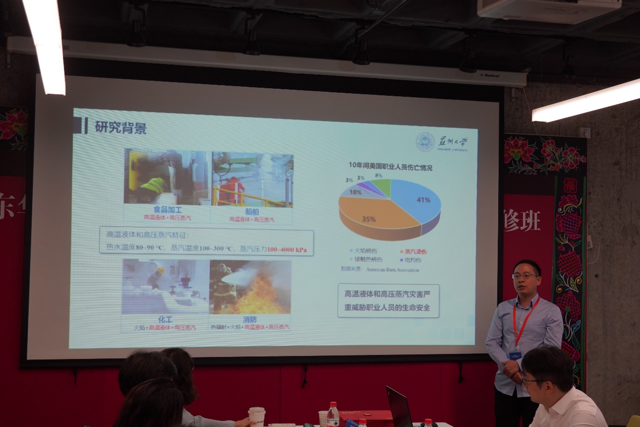 best365体育亚洲官网服装设计与工程系苏云副教授的报告主题是“相变微胶囊滴塑织物的制备及其在消防服中的应用研究”,他介绍了相变微胶囊在消防服中的应用现状及不足,提出了一种能够改善消防服热湿舒适性的工艺方法,并通过实验测试分析了不同滴塑工艺参数对消防服热湿舒适性、热防护性的影响,提出了最优参数设计。