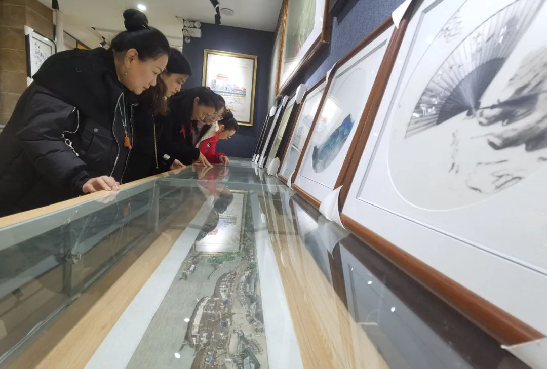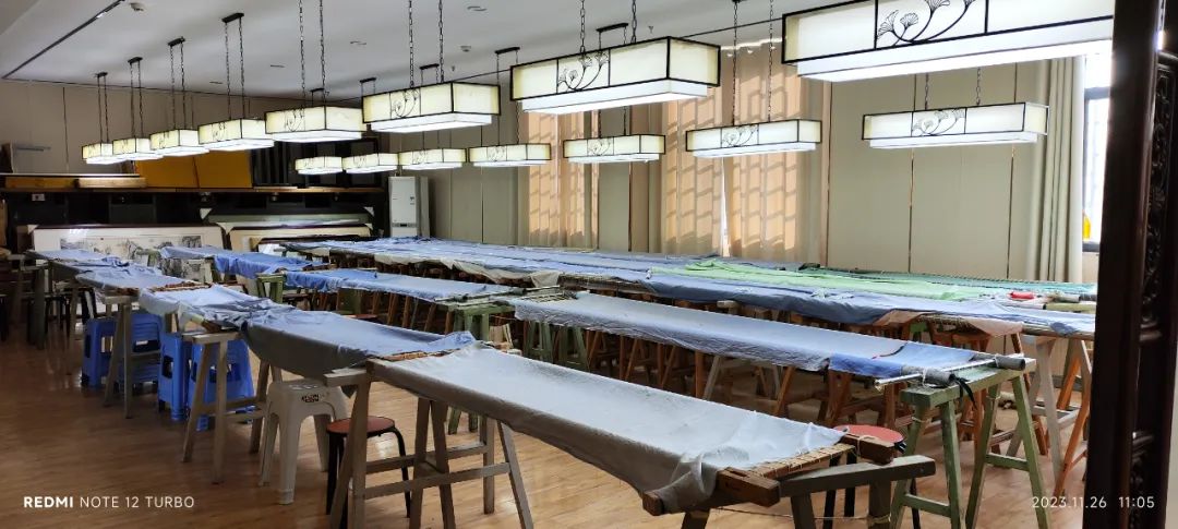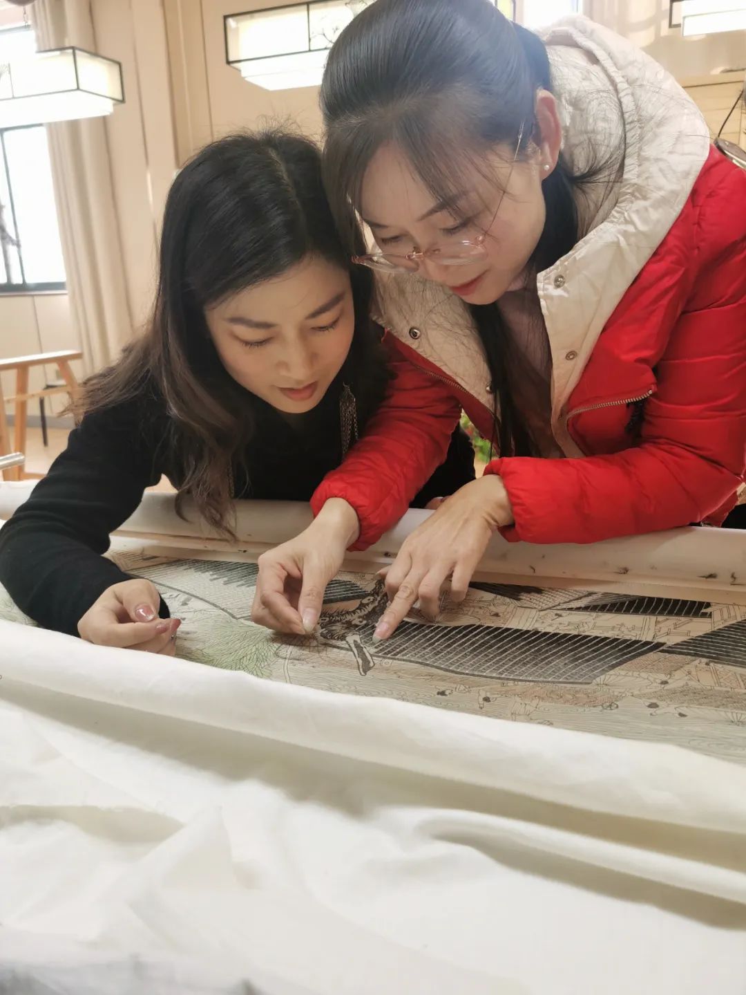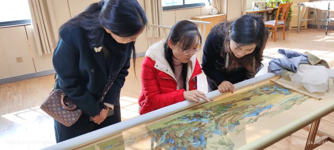 开封汴绣厂是著名国营老厂。荣誉墙上挂着几十块闪着金光的铭牌。一楼展示厅中更是挤满了汴绣精品。令回访组惊喜的是二楼的传习室宽敞明亮,绣画绷整齐排开。因为周围的公司开设汴绣课程定期有员工来此学习体验。不少公司现在强调“双师型”教育,所以学习汴绣的老师也越来越多;而逢到寒暑假,外地的实践团队也很多。平时的郭华既忙于参加外出的各类演示体验活动,也忙于在此教授公司的师生来学习体验。二楼绣绷上有一幅郭华绣制进程中的《千里江山图》所有人看到了不禁惊呼。