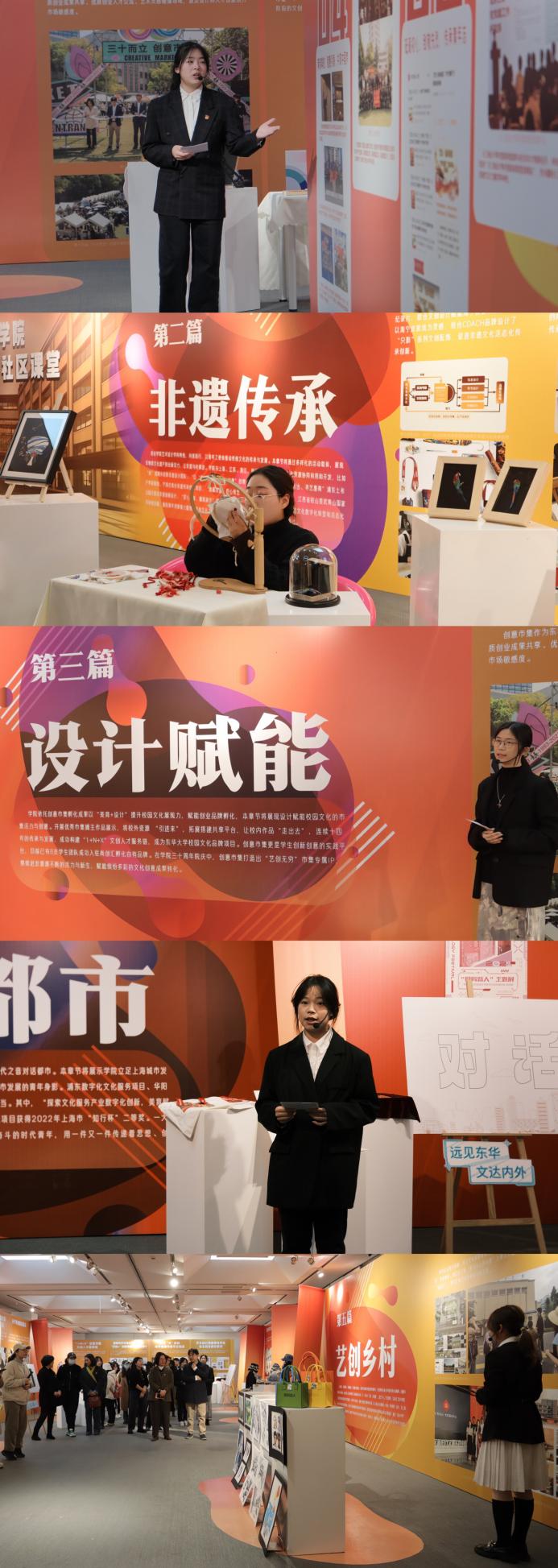 本次展览通过“展”、“演”、“秀”等多元形式,从“逐梦先锋”、“非遗传承”、“设计赋能”、“对话都市”、“艺创乡村”五个篇章,以回顾展现的视角,总结了公司近年来在红色文化、设计文化、传统文化、创意文化、实践文化方面取得的成效,呈现了公司以深入实施“时代新人铸魂工程”为牵引,在实践育人、文化育人、网络育人中实现的公司“小课堂”与社会“大课堂”的双向互动。