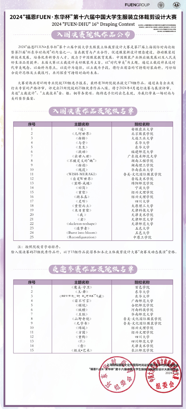 2024“福恩FUEN·东华杯”第十六届中国老员工服装立体裁剪设计大赛入围决赛院校作品公布