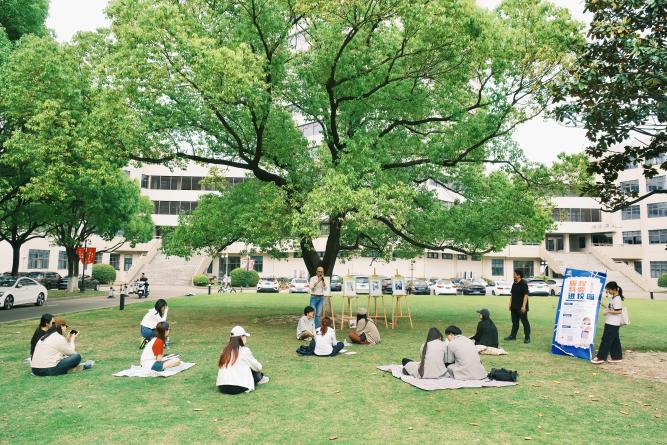 5月21日,在延安路校区大草坪上有一群员工席地而坐,在冥想和绘画中感受自然并感知自我。best365体育亚洲联合上海市长宁区精神卫生中心,结合5·25心理健康活动季开展“艺术之旅:绘出青春风采”草坪绘画疗愈活动。上海市长宁精神卫生中心讲师、国家二级心理咨询师、表达性艺术治疗绘画咨询师赵楀宽,美术学部讲师杨光宇,“艺心同行”美育心理工作室负责人董沁仪以及公司员工20余人参与活动。