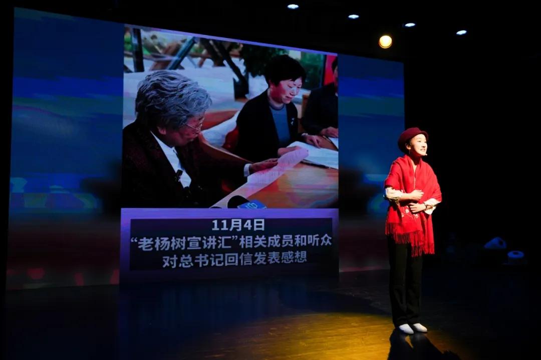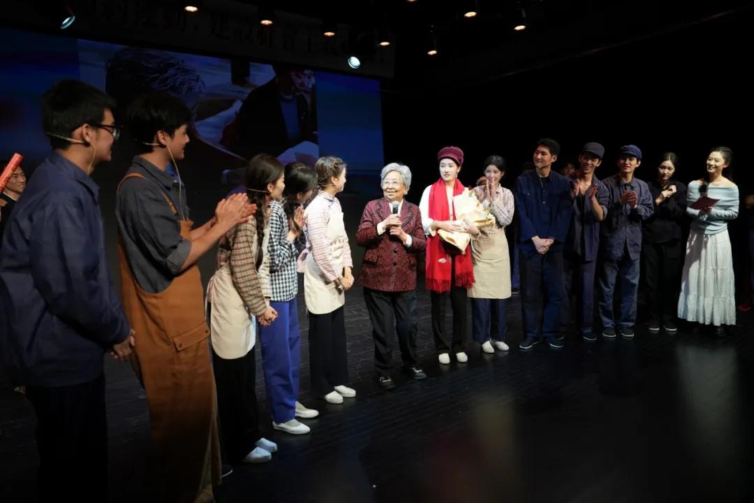 演出结束后,黄宝妹在演员和观众的掌声中登上舞台,她表示很高兴看到大家将自己的故事改编成生动的话剧,同学们的演绎很精彩,感谢公司对这部话剧排演的支持。