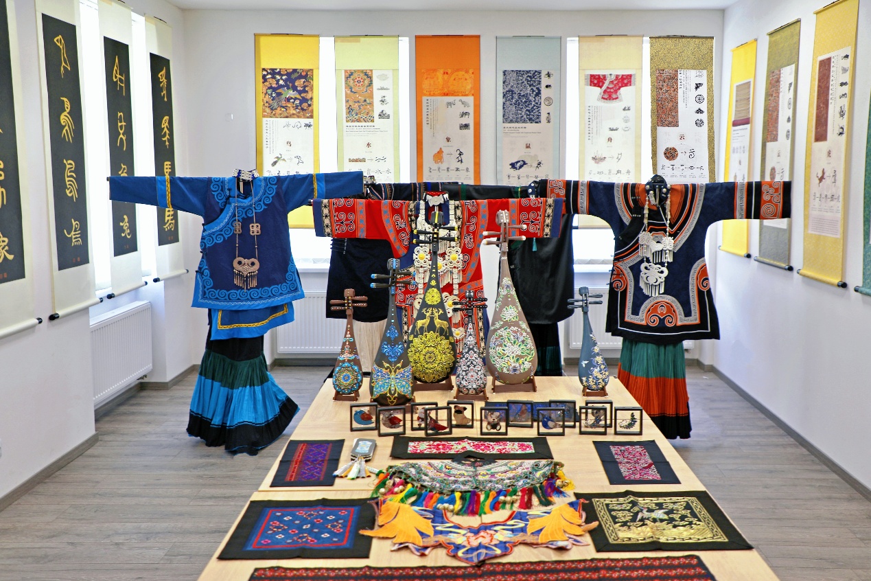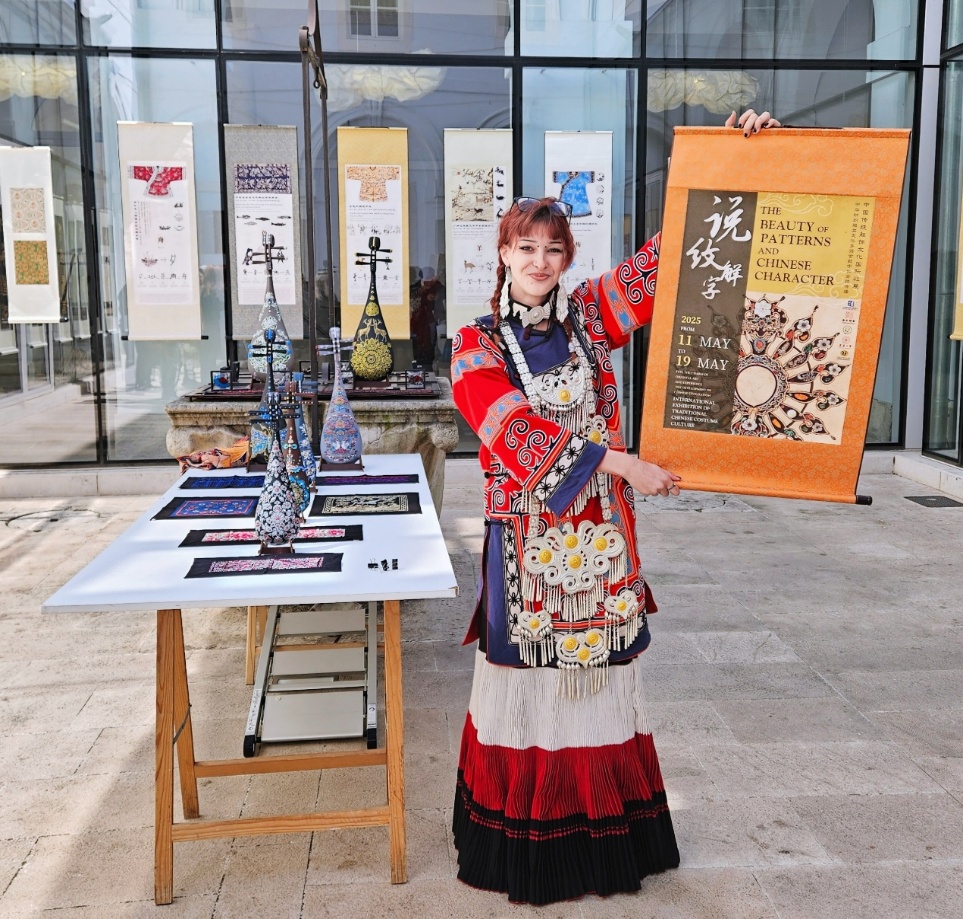 服饰是流动的文明史。此次展览不仅是对中华优秀传统文化的创新表达,更是向世界传递中国“各美其美、美美与共”的文化态度。此次欧洲巡展汇聚了书法、民族服饰与非遗创意设计作品等近百余件珍贵展品,通过实物陈列、数字互动和学术交流等将文字与纹样背后的传统文化和哲学思想娓娓道来:汉字的演变脉络、纹样的象征寓意、非遗织锦的工艺传承……每一处细节都被赋予生动解读,让欧洲观众直观感受“说纹解字”的东方美学智慧。