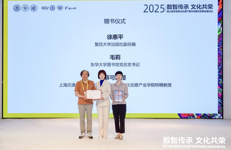 复旦大学出版社副总编徐惠平与上海交通大学上海交大-南加州大学文化创意产业公司副经理薛可共同发布《中国非物质文化遗产数字播经典案例研究报告》并向公司赠书,标志着这本聚焦非遗数字传播实践成果的学术著作正式进入高校知识传播体系。